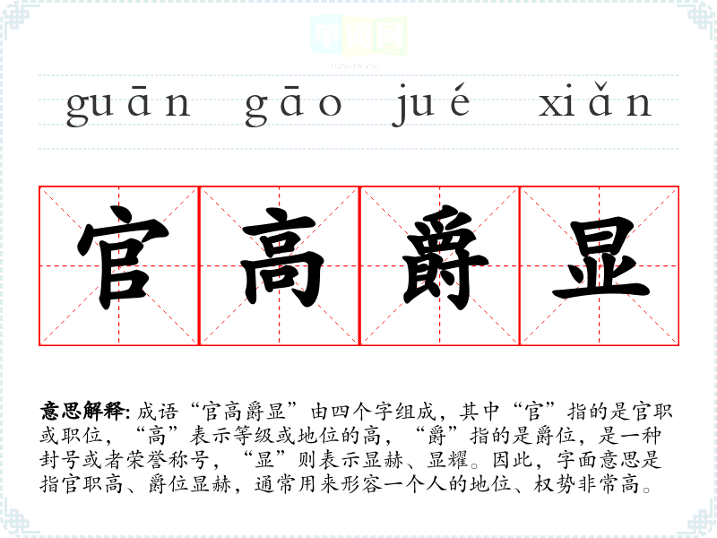 成语“官高爵显”由四个字组成,其中“官”指的是官职或职位,“高”表示等级或地位的高,“爵”指的是爵位,是一种封号或者荣誉称号,“显”则表示显赫、显耀。因此,字面意思是指官职高、爵位显赫,通常用来形容一个人的地位、权势非常高。
