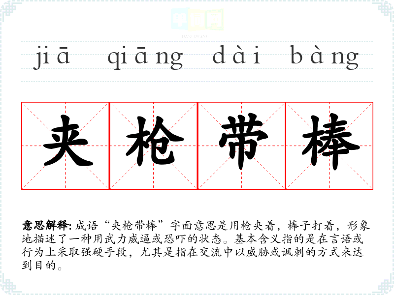 成语“夹枪带棒”字面意思是用枪夹着,棒子打着,形象地描述了一种用武力威逼或恐吓的状态。基本含义指的是在言语或行为上采取强硬手段,尤其是指在交流中以威胁或讽刺的方式来达到目的。