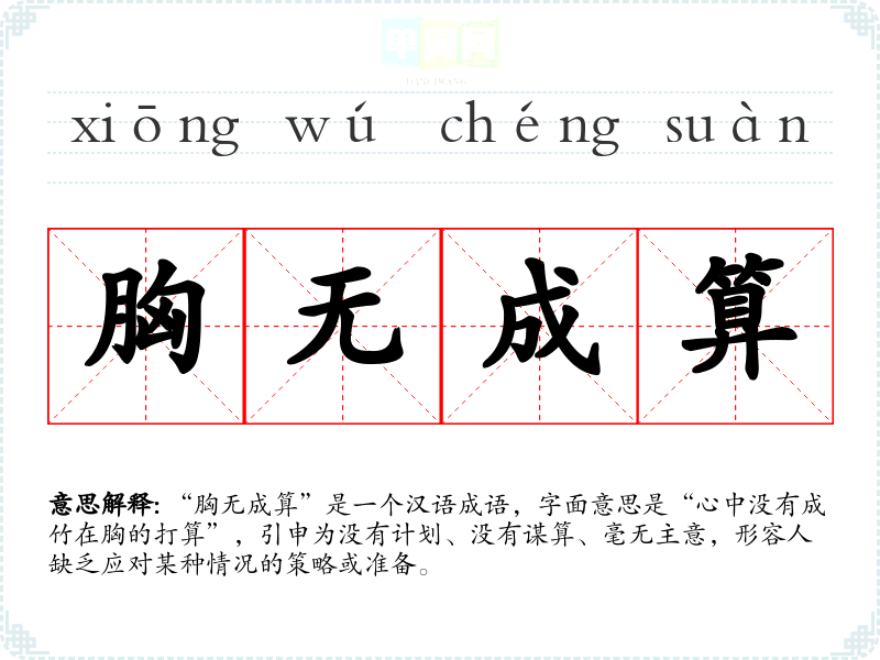 成竹在胸 成竹:现成完整的竹子。画竹前竹的全貌已在胸中。比喻在做事之前已经拿定主义。