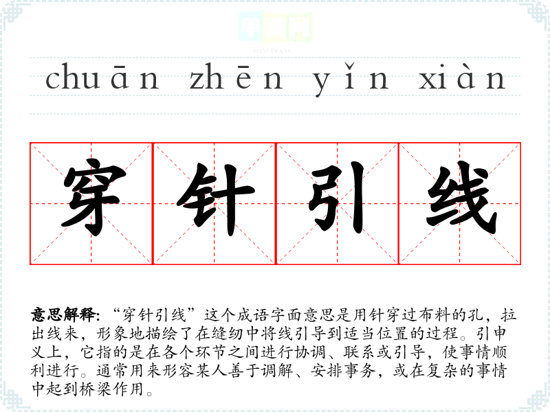 “穿针引线”这个成语字面意思是用针穿过布料的孔,拉出线来,形象地描绘了在缝纫中将线引导到适当位置的过程。引申义上,它指的是在各个环节之间进行协调、联系或引导,使事情顺利进行。通常用来形容某人善于调解、安排事务,或在复杂的事情中起到桥梁作用。