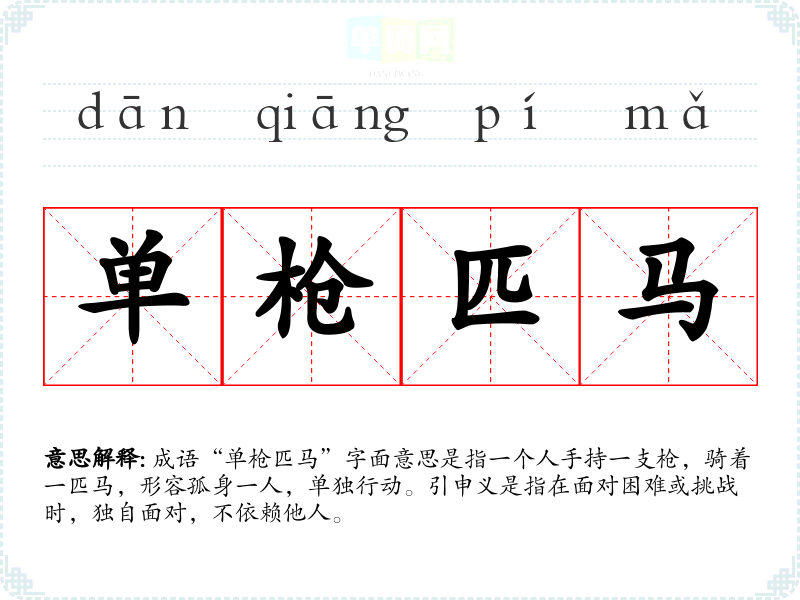 成语“单枪匹马”字面意思是指一个人手持一支枪,骑着一匹马,形容孤身一人,单独行动。引申义是指在面对困难或挑战时,独自面对,不依赖他人。
