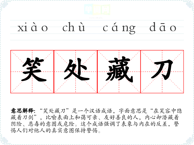 “笑处藏刀”是一个汉语成语,字面意思是“在笑容中隐藏着刀剑”,比喻表面上和蔼可亲、友好善良的人,内心却潜藏着阴险、恶毒的意图或危险。这个成语强调了表象与内在的反差,警惕人们对他人的真实意图保持警惕。