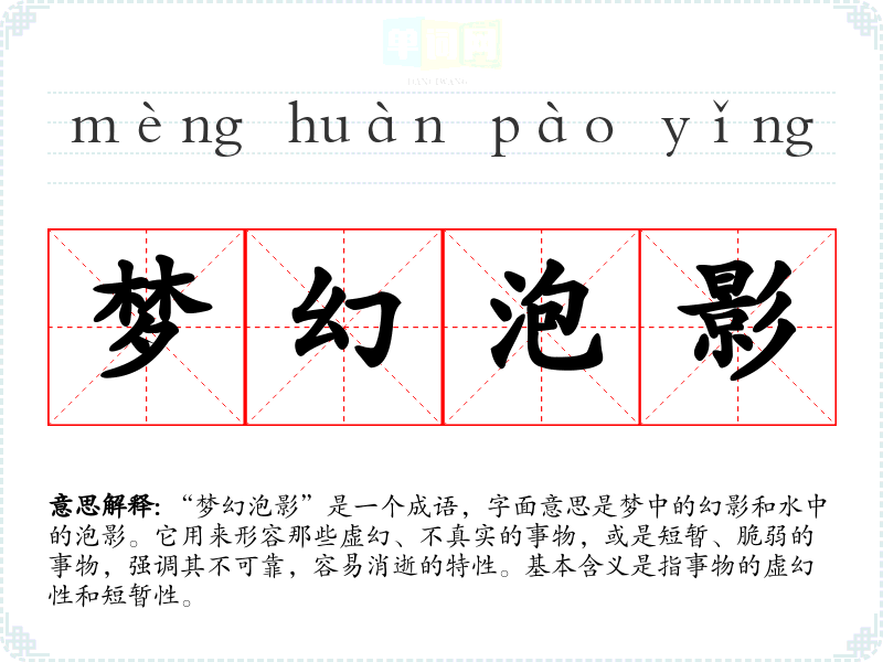 “梦幻泡影”是一个成语,字面意思是梦中的幻影和水中的泡影。它用来形容那些虚幻、不真实的事物,或是短暂、脆弱的事物,强调其不可靠,容易消逝的特性。基本含义是指事物的虚幻性和短暂性。