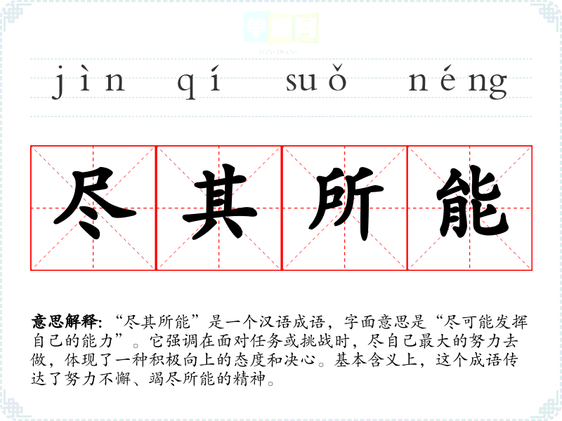 “尽其所能”是一个汉语成语,字面意思是“尽可能发挥自己的能力”。它强调在面对任务或挑战时,尽自己最大的努力去做,体现了一种积极向上的态度和决心。基本含义上,这个成语传达了努力不懈、竭尽所能的精神。