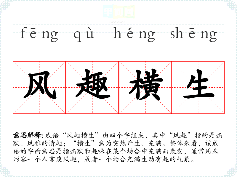 成语“风趣横生”由四个字组成,其中“风趣”指的是幽默、风雅的情趣;“横生”意为突然产生、充满。整体来看,该成语的字面意思是指幽默和趣味在某个场合中充满而散发,通常用来形容一个人言谈风趣,或者一个场合充满生动有趣的气氛。