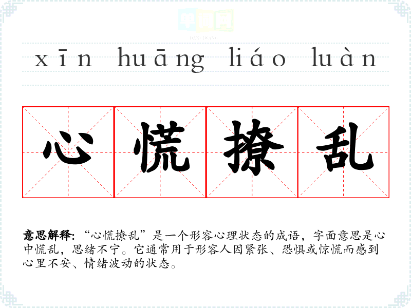 “心慌撩乱”是一个形容心理状态的成语,字面意思是心中慌乱,思绪不宁。它通常用于形容人因紧张、恐惧或惊慌而感到心里不安、情绪波动的状态。