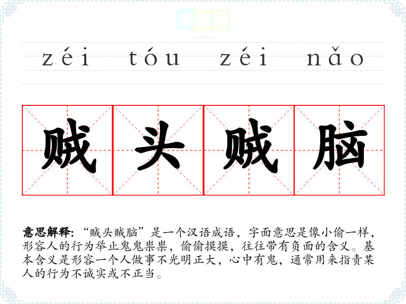 | 贼头贼脑 | 形容举动偷偷摸摸,不光明正大。 |