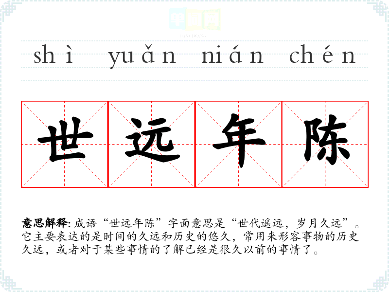 | 世远年陈 | 远:久远;陈:陈旧。年代已经相隔很久远了。 |