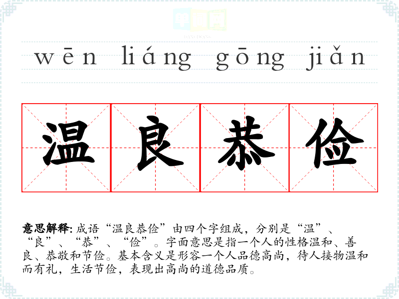 - 日常对话:可以在家庭教育、朋友间的交流中提到,鼓励孩子或年轻人要有温良恭俭的品性。