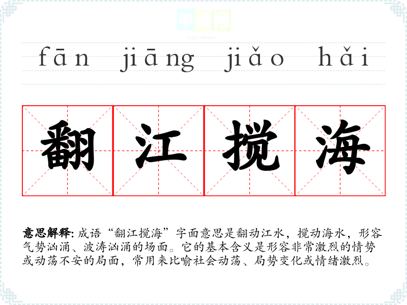 成语“翻江搅海”字面意思是翻动江水,搅动海水,形容气势汹涌、波涛汹涌的场面。它的基本含义是形容非常激烈的情势或动荡不安的局面,常用来比喻社会动荡、局势变化或情绪激烈。