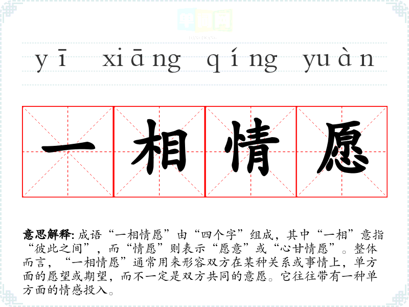 成语“一相情愿”由“四个字”组成,其中“一相”意指“彼此之间”,而“情愿”则表示“愿意”或“心甘情愿”。整体而言,“一相情愿”通常用来形容双方在某种关系或事情上,单方面的愿望或期望,而不一定是双方共同的意愿。它往往带有一种单方面的情感投入。