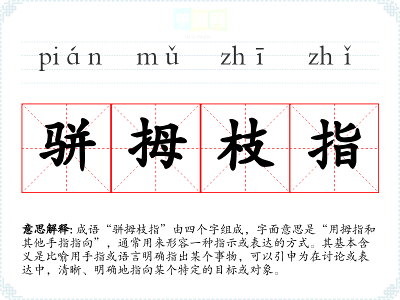 成语“骈拇枝指”由四个字组成,字面意思是“用拇指和其他手指指向”,通常用来形容一种指示或表达的方式。其基本含义是比喻用手指或语言明确指出某个事物,可以引申为在讨论或表达中,清晰、明确地指向某个特定的目标或对象。