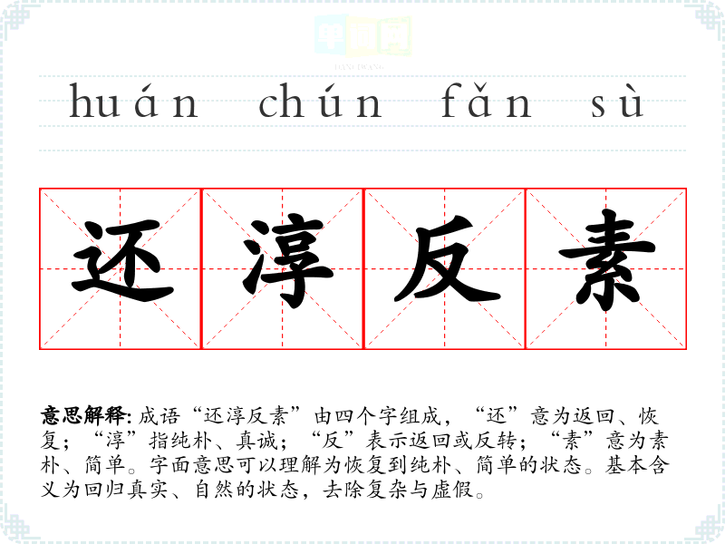 成语“还淳反素”由四个字组成,“还”意为返回、恢复;“淳”指纯朴、真诚;“反”表示返回或反转;“素”意为素朴、简单。字面意思可以理解为恢复到纯朴、简单的状态。基本含义为回归真实、自然的状态,去除复杂与虚假。