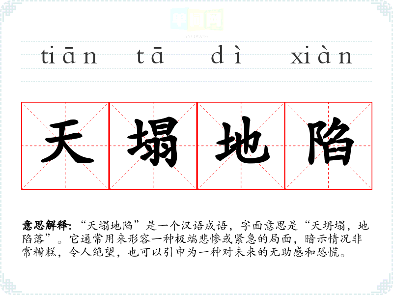 “天塌地陷”是一个汉语成语,字面意思是“天坍塌,地陷落”。它通常用来形容一种极端悲惨或紧急的局面,暗示情况非常糟糕,令人绝望,也可以引申为一种对未来的无助感和恐慌。