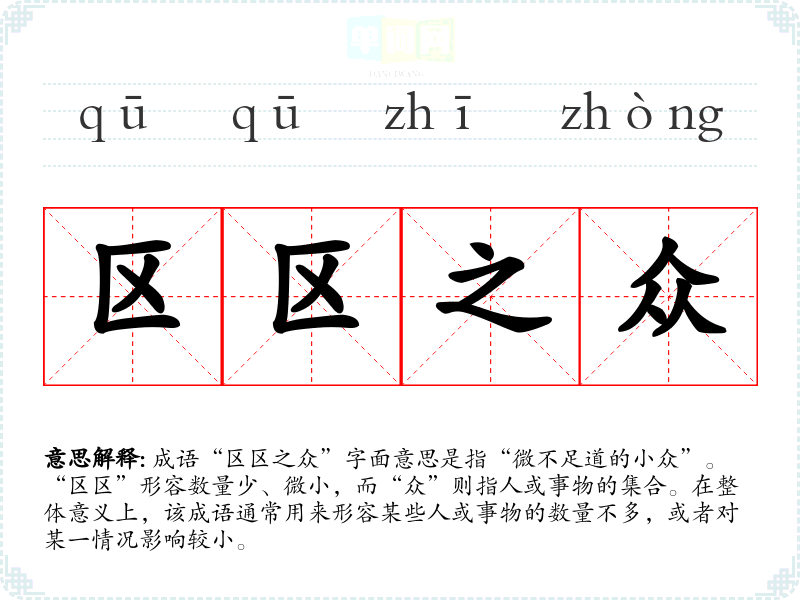 成语“区区之众”字面意思是指“微不足道的小众”。“区区”形容数量少、微小,而“众”则指人或事物的集合。在整体意义上,该成语通常用来形容某些人或事物的数量不多,或者对某一情况影响较小。