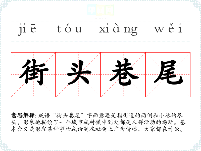 成语“街头巷尾”字面意思是指街道的两侧和小巷的尽头,形象地描绘了一个城市或村镇中到处都是人群活动的场所。基本含义是形容某种事物或话题在社会上广为传播,大家都在讨论。