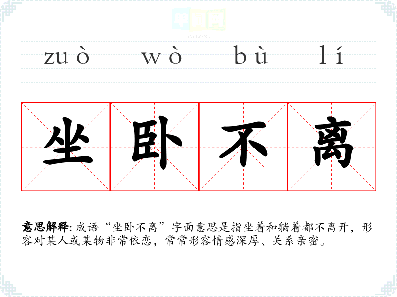 成语“坐卧不离”字面意思是指坐着和躺着都不离开,形容对某人或某物非常依恋,常常形容情感深厚、关系亲密。
