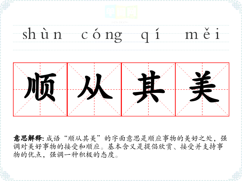 成语“顺从其美”的字面意思是顺应事物的美好之处,强调对美好事物的接受和顺应。基本含义是提倡欣赏、接受并支持事物的优点,强调一种积极的态度。