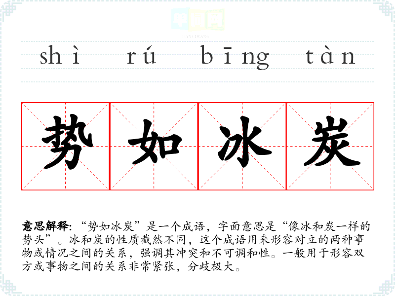 “势如冰炭”是一个成语,字面意思是“像冰和炭一样的势头”。冰和炭的性质截然不同,这个成语用来形容对立的两种事物或情况之间的关系,强调其冲突和不可调和性。一般用于形容双方或事物之间的关系非常紧张,分歧极大。