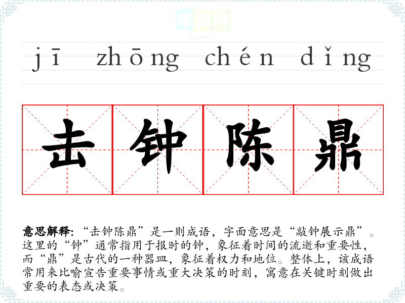 “击钟陈鼎”是一则成语,字面意思是“敲钟展示鼎”。这里的“钟”通常指用于报时的钟,象征着时间的流逝和重要性,而“鼎”是古代的一种器皿,象征着权力和地位。整体上,该成语常用来比喻宣告重要事情或重大决策的时刻,寓意在关键时刻做出重要的表态或决策。