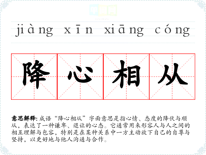 成语“降心相从”字面意思是指心情、态度的降伏与顺从,表达了一种谦卑、退让的心态。它通常用来形容人与人之间的相互理解与包容,特别是在某种关系中一方主动放下自己的自尊与坚持,以更好地与他人沟通与合作。