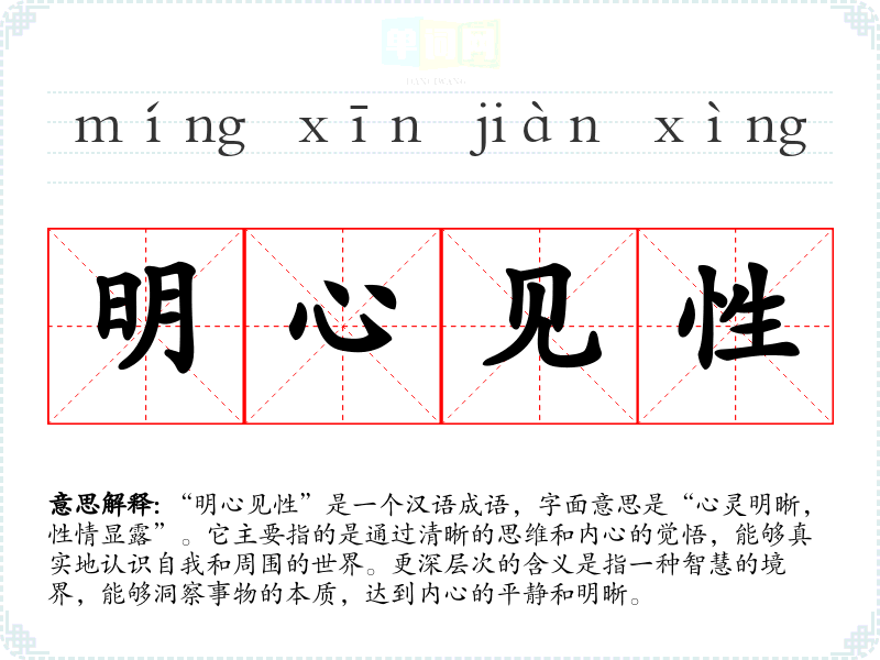 “明心见性”是一个汉语成语,字面意思是“心灵明晰,性情显露”。它主要指的是通过清晰的思维和内心的觉悟,能够真实地认识自我和周围的世界。更深层次的含义是指一种智慧的境界,能够洞察事物的本质,达到内心的平静和明晰。