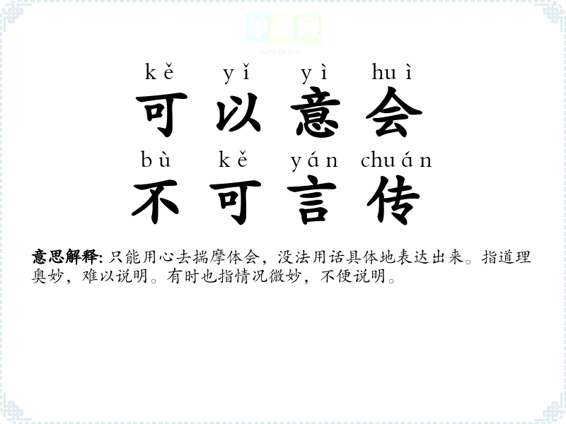 | 可以意会,不可言传 | 只能用心去揣摩体会,没法用话具体地表达出来。指道理奥妙,难以说明。有时也指情况微妙,不便说明。 |