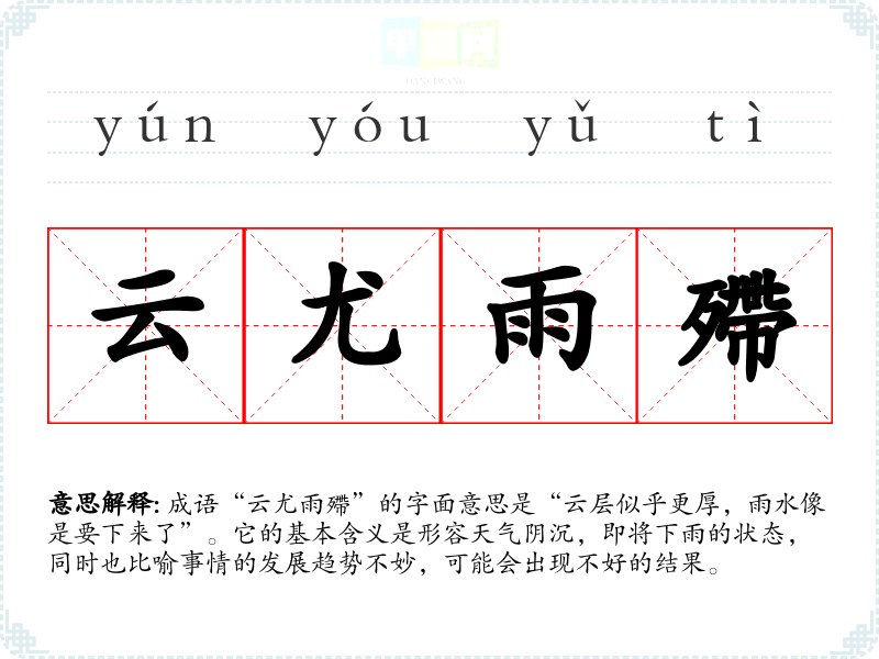 成语“云尤雨殢”的字面意思是“云层似乎更厚,雨水像是要下来了”。它的基本含义是形容天气阴沉,即将下雨的状态,同时也比喻事情的发展趋势不妙,可能会出现不好的结果。