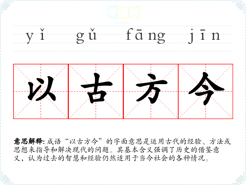 成语“以古方今”的字面意思是运用古代的经验、方法或思想来指导和解决现代的问题。其基本含义强调了历史的借鉴意义,认为过去的智慧和经验仍然适用于当今社会的各种情况。