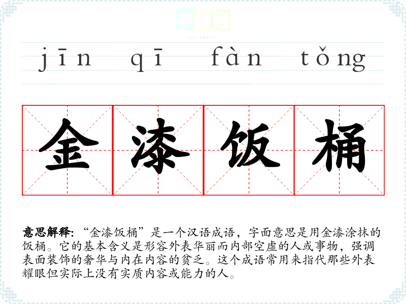 “金漆饭桶”是一个汉语成语,字面意思是用金漆涂抹的饭桶。它的基本含义是形容外表华丽而内部空虚的人或事物,强调表面装饰的奢华与内在内容的贫乏。这个成语常用来指代那些外表耀眼但实际上没有实质内容或能力的人。