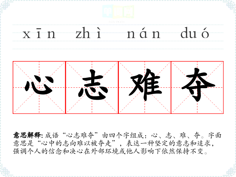 成语“心志难夺”由四个字组成:心、志、难、夺。字面意思是“心中的志向难以被夺走”,表达一种坚定的意志和追求,强调个人的信念和决心在外部环境或他人影响下依然保持不变。