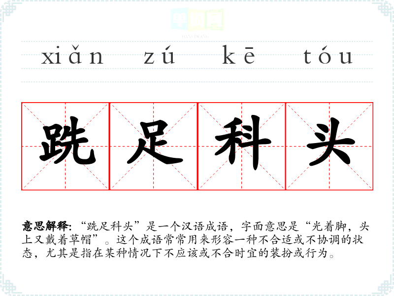 “跣足科头”是一个汉语成语,字面意思是“光着脚,头上又戴着草帽”。这个成语常常用来形容一种不合适或不协调的状态,尤其是指在某种情况下不应该或不合时宜的装扮或行为。
