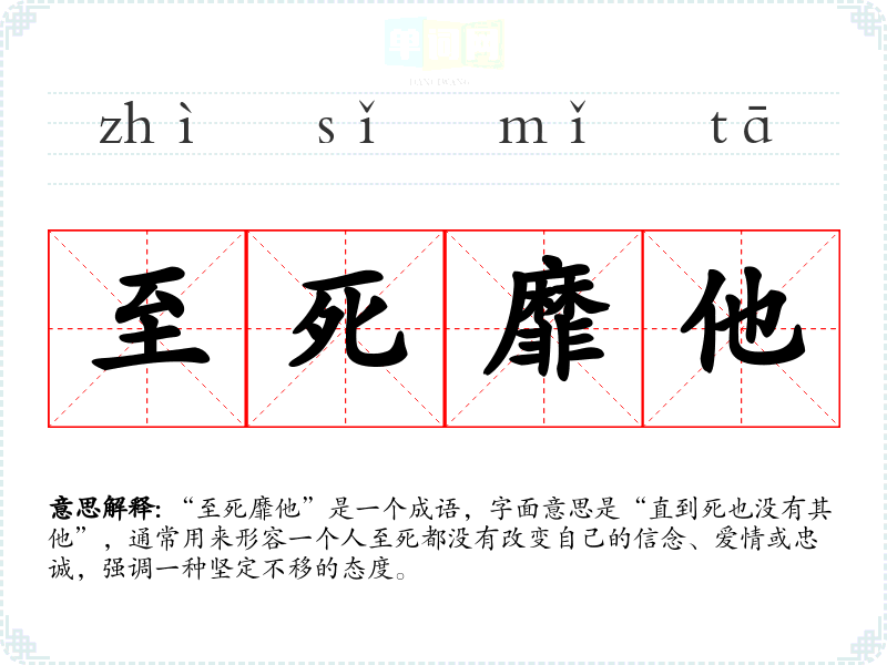 “至死靡他”是一个成语,字面意思是“直到死也没有其他”,通常用来形容一个人至死都没有改变自己的信念、爱情或忠诚,强调一种坚定不移的态度。
