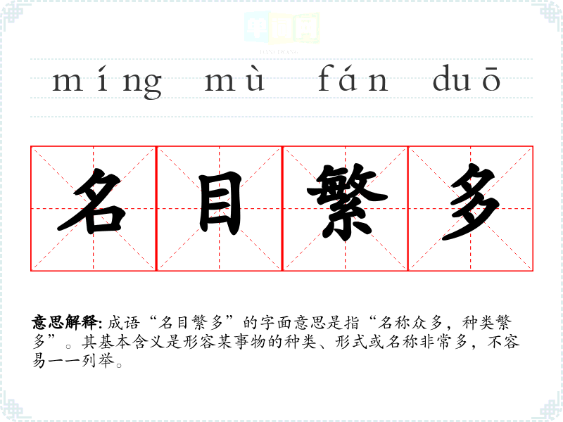 成语“名目繁多”的字面意思是指“名称众多,种类繁多”。其基本含义是形容某事物的种类、形式或名称非常多,不容易一一列举。