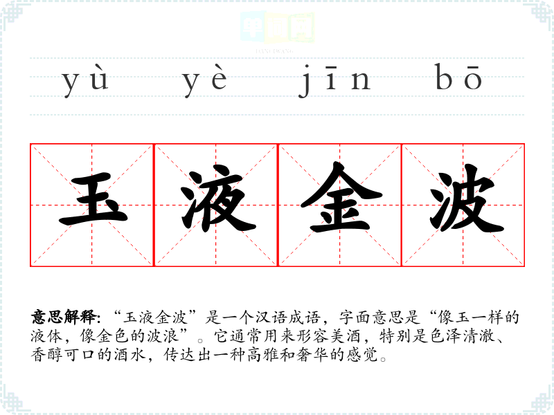 “玉液金波”是一个汉语成语,字面意思是“像玉一样的液体,像金色的波浪”。它通常用来形容美酒,特别是色泽清澈、香醇可口的酒水,传达出一种高雅和奢华的感觉。