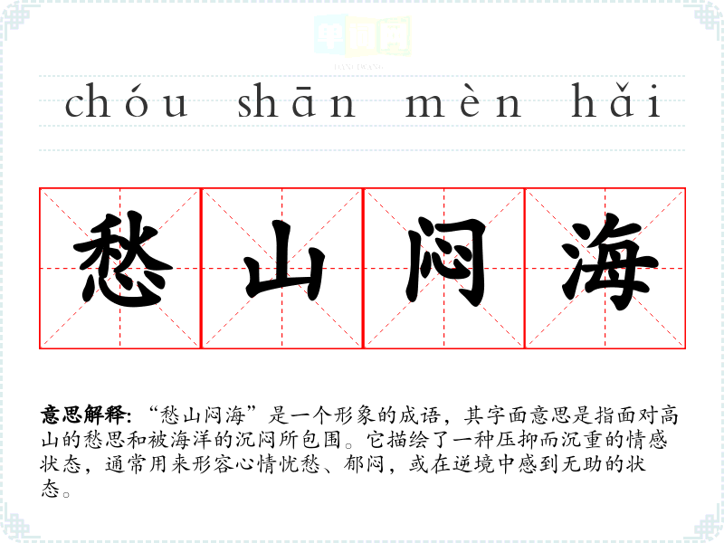 | 愁山闷海 | 忧愁如山,苦闷似海。形容愁闷象山一样大,象海一样深,无法排遣。 |