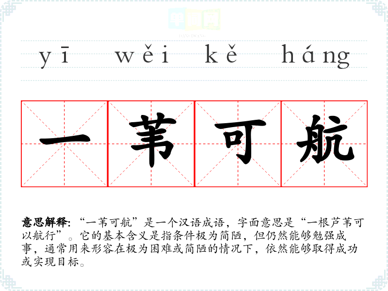 “一苇可航”是一个汉语成语,字面意思是“一根芦苇可以航行”。它的基本含义是指条件极为简陋,但仍然能够勉强成事,通常用来形容在极为困难或简陋的情况下,依然能够取得成功或实现目标。
