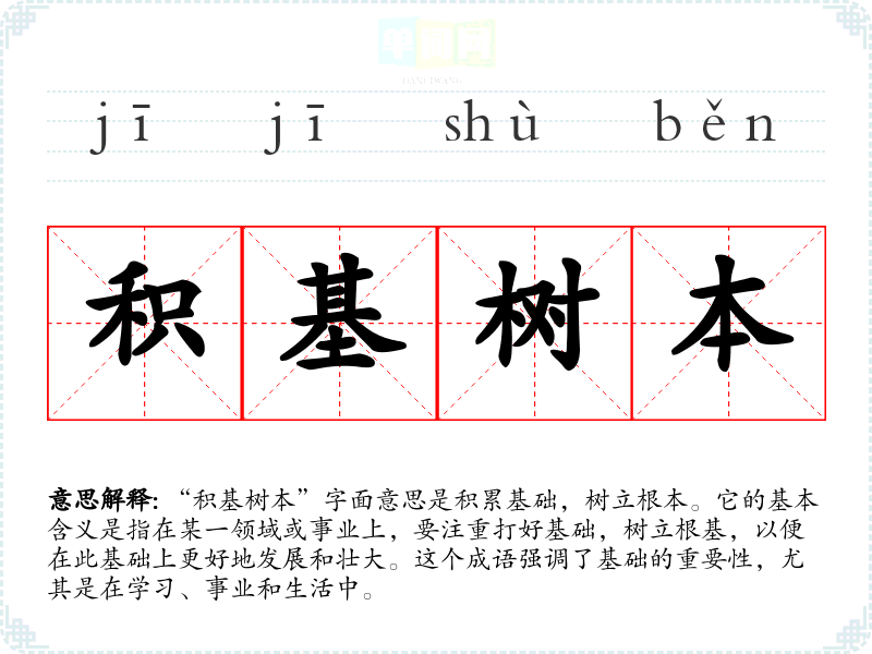 “积基树本”字面意思是积累基础,树立根本。它的基本含义是指在某一领域或事业上,要注重打好基础,树立根基,以便在此基础上更好地发展和壮大。这个成语强调了基础的重要性,尤其是在学*、事业和生活中。