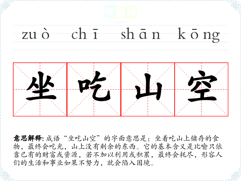 成语“坐吃山空”的字面意思是:坐着吃山上储存的食物,最终会吃光,山上没有剩余的东西。它的基本含义是比喻只依靠已有的财富或资源,若不加以利用或积累,最终会耗尽,形容人们的生活和事业如果不努力,就会陷入困境。