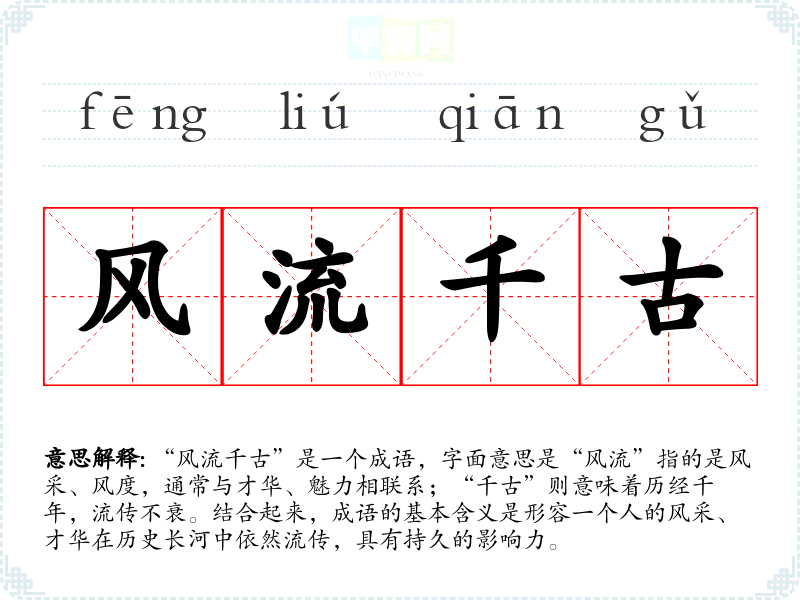 “风流千古”是一个成语,字面意思是“风流”指的是风采、风度,通常与才华、魅力相联系;“千古”则意味着历经千年,流传不衰。结合起来,成语的基本含义是形容一个人的风采、才华在历史长河中依然流传,具有持久的影响力。