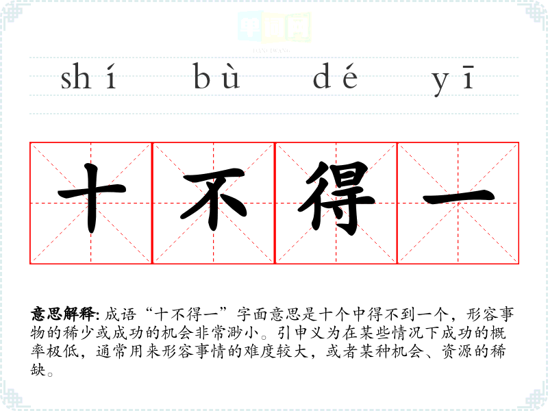 成语“十不得一”字面意思是十个中得不到一个,形容事物的稀少或成功的机会非常渺小。引申义为在某些情况下成功的概率极低,通常用来形容事情的难度较大,或者某种机会、资源的稀缺。