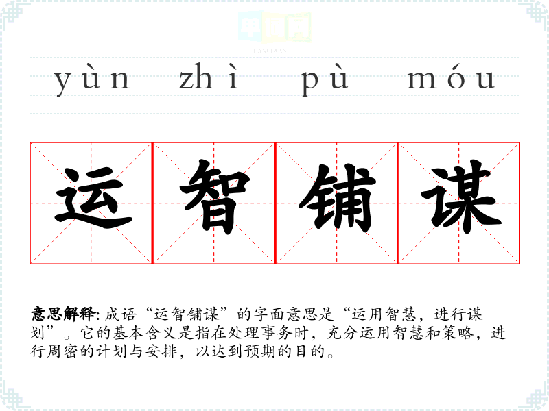 成语“运智铺谋”的字面意思是“运用智慧,进行谋划”。它的基本含义是指在处理事务时,充分运用智慧和策略,进行周密的计划与安排,以达到预期的目的。
