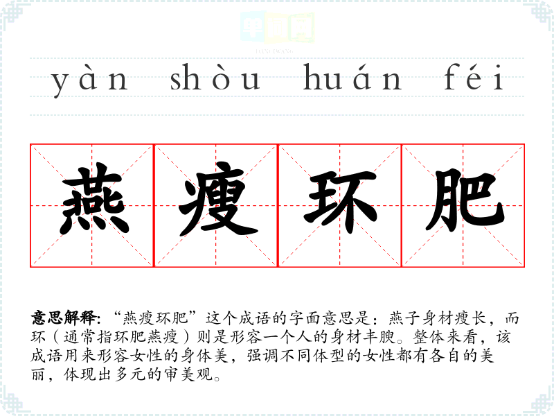 “燕瘦环肥”这个成语的字面意思是:燕子身材瘦长,而环(通常指环肥燕瘦)则是形容一个人的身材丰腴。整体来看,该成语用来形容女性的身体美,强调不同体型的女性都有各自的美丽,体现出多元的审美观。