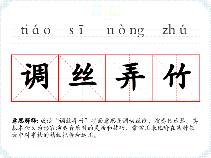 成语“调丝弄竹”字面意思是调动丝线,演奏竹乐器。其基本含义为形容演奏音乐时的灵活和技巧,常常用来比喻在某种领域中对事物的精细把握和运用。