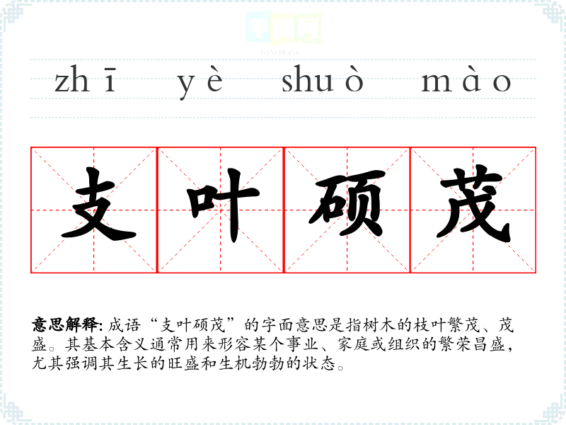 成语“支叶硕茂”的字面意思是指树木的枝叶繁茂、茂盛。其基本含义通常用来形容某个事业、家庭或组织的繁荣昌盛,尤其强调其生长的旺盛和生机勃勃的状态。