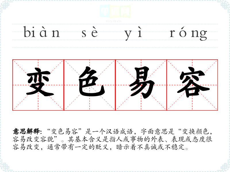 “变色易容”是一个汉语成语,字面意思是“变换颜色,容易改变容貌”。其基本含义是指人或事物的外表、表现或态度很容易改变,通常带有一定的贬义,暗示着不真诚或不稳定。