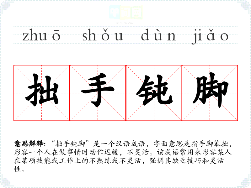 “拙手钝脚”是一个汉语成语,字面意思是指手脚笨拙,形容一个人在做事情时动作迟缓,不灵活。该成语常用来形容某人在某项技能或工作上的不熟练或不灵活,强调其缺乏技巧和灵活性。