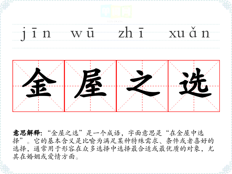“金屋之选”是一个成语,字面意思是“在金屋中选择”。它的基本含义是比喻为满足某种特殊需求、条件或者喜好的选择,通常用于形容在众多选择中选择最合适或最优质的对象,尤其在婚姻或爱情方面。
