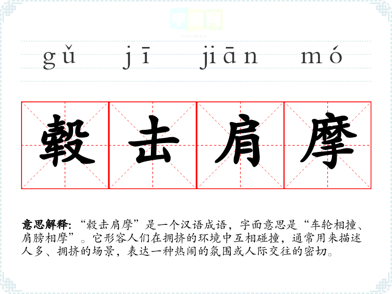 “毂击肩摩”是一个汉语成语,字面意思是“车轮相撞、肩膀相摩”。它形容人们在拥挤的环境中互相碰撞,通常用来描述人多、拥挤的场景,表达一种热闹的氛围或人际交往的密切。