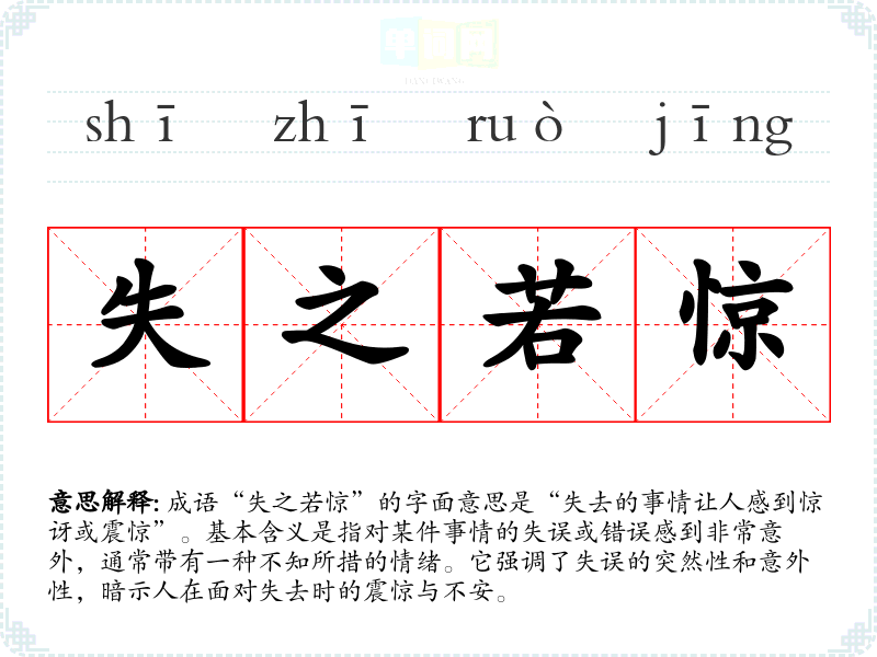 成语“失之若惊”的字面意思是“失去的事情让人感到惊讶或震惊”。基本含义是指对某件事情的失误或错误感到非常意外,通常带有一种不知所措的情绪。它强调了失误的突然性和意外性,暗示人在面对失去时的震惊与不安。